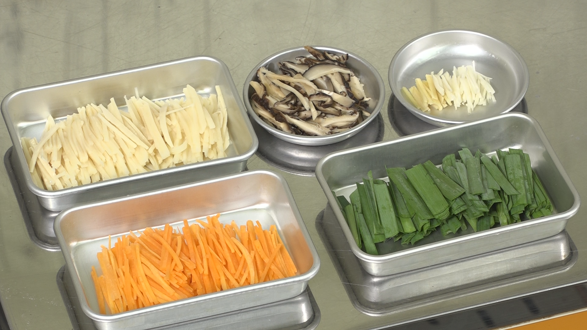 にんじん、たけのこ、干し椎茸は4~5㎝の長さに千切りにする。にらは根本の固い部分を少し切り捨て、4~5㎝の長さに切り揃える。にんにく、しょうがも千切りにする。