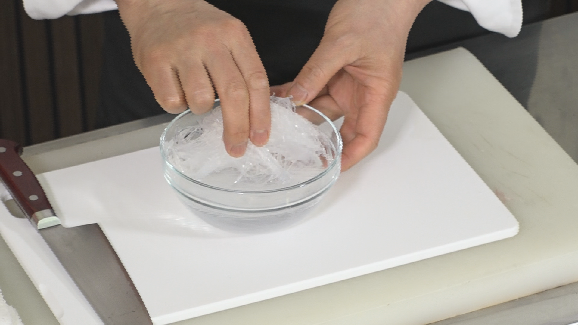 春雨は水につけて半戻しにし、水気をよくきってから4~5㎝の長さに切る。