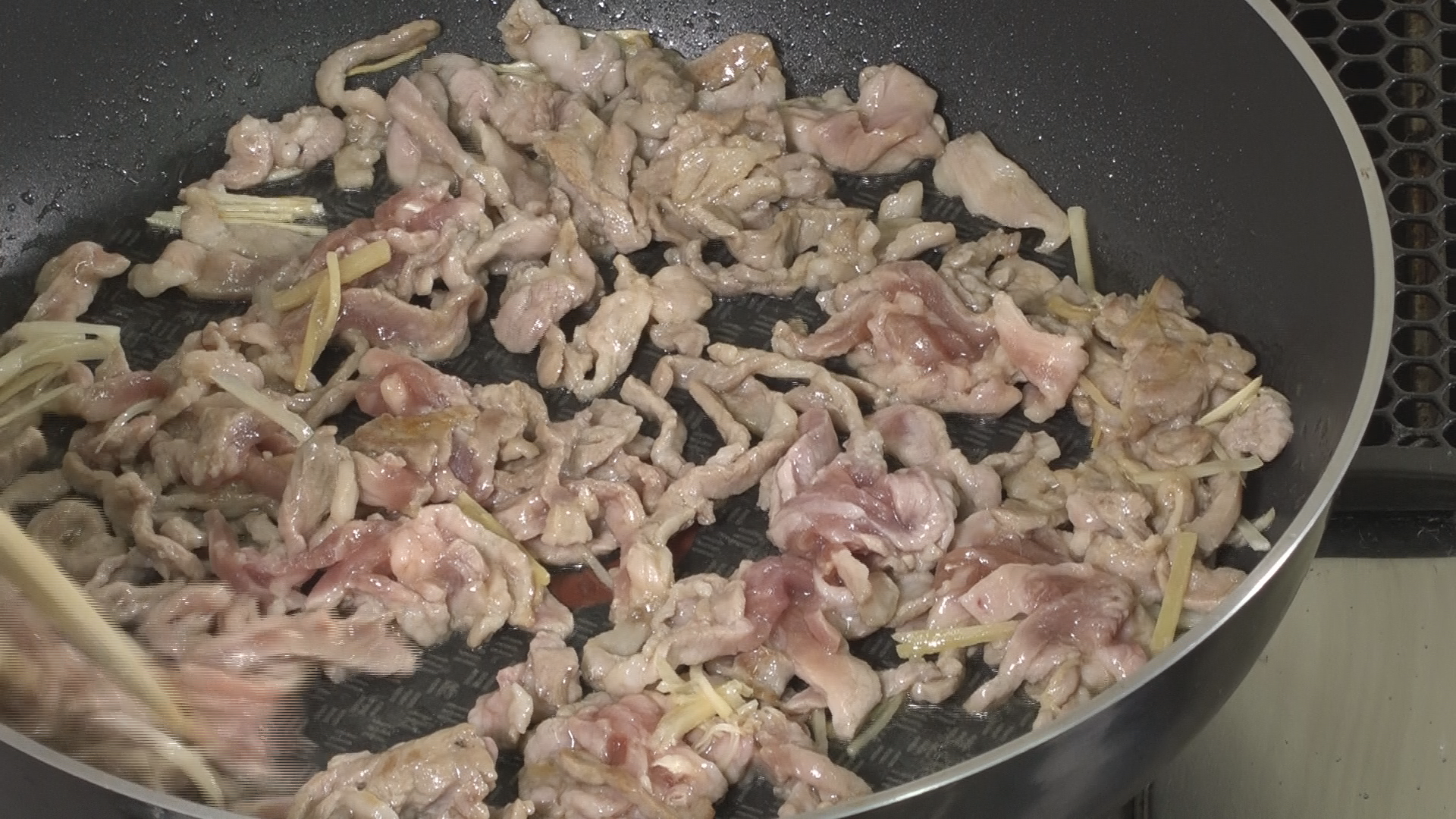 フライパンを熱して油を加え、にんにくとしょうがを弱火で炒めて油に香りを移したら、豚肉を加えて強火で炒める。