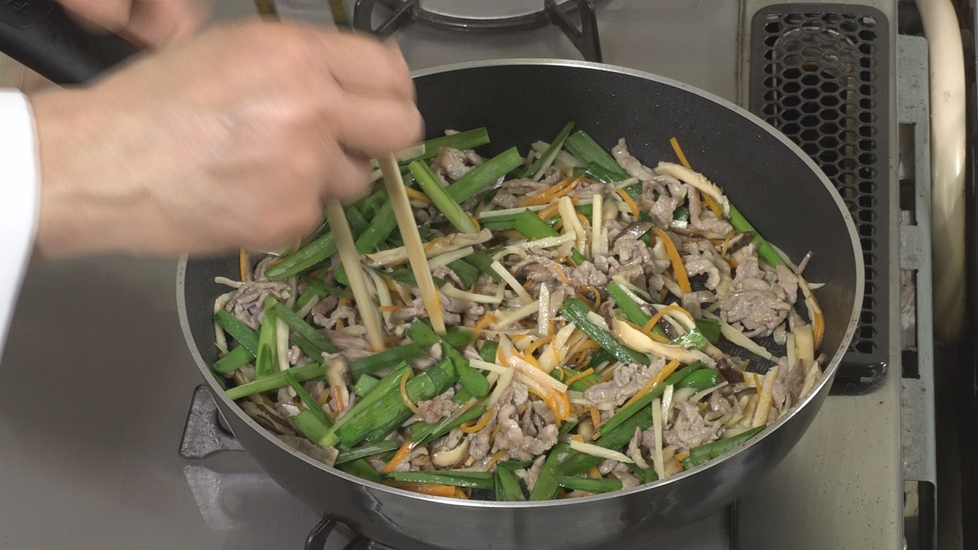 豚肉の色が白く変わったら、にんじん、干し椎茸、たけのこ、にらの順に加えて炒める。