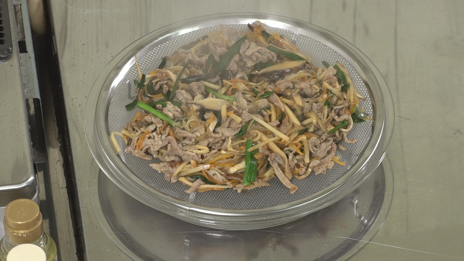 調味料を加えて混ぜ合わせてから春雨を加え、春雨が透明になったら水溶き片栗粉でとろみをつけ、盆ざるにあけてあら熱を抜き、10等分する。