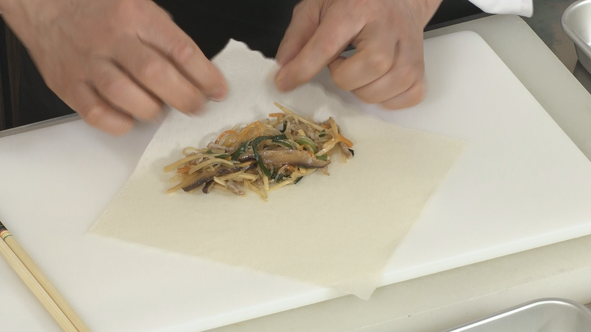 まな板に春巻きの皮を置き、⑥の具を手前にのせて包み、水で溶いた小麦粉で巻き終わりを止める。
