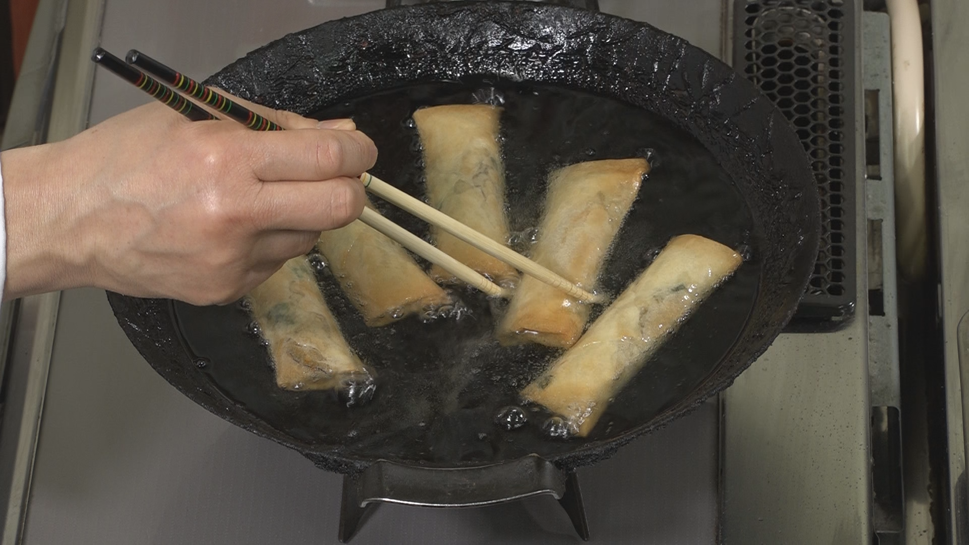 揚げ油を熱して春巻きを入れ、綺麗な揚げ色がつくまで何度か返しながらじっくりと揚げる。